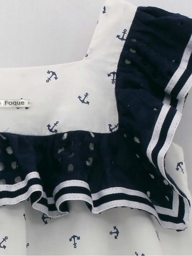 Vestido niña confeccionado con tejido estampado anclas, escote cuadrado con volante en tejido bordado navy estilo marinero. Tallaje de 0 meses a 6 años. Colección Ancla. Hecho en España.