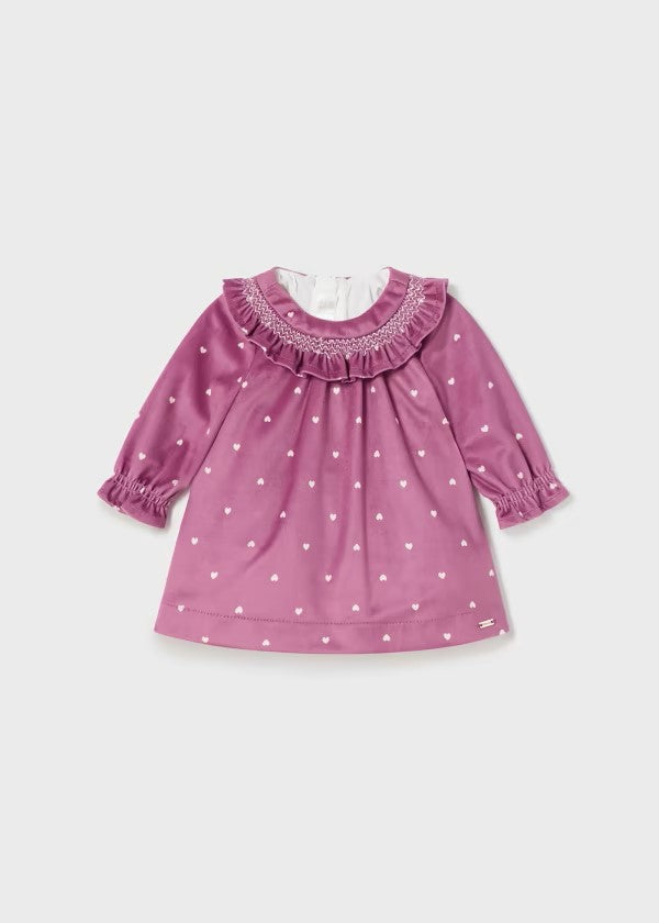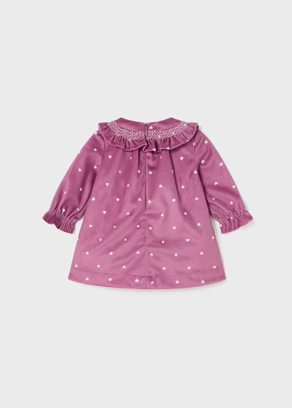 Vestido de manga larga para recién nacido con puños elásticos. Cuello redondo con volante. Cierre con cremallera trasera invisible. Confección en tejido de terciopelo elegante y clásico. Diseño con punto smock. Diseño estampado.
