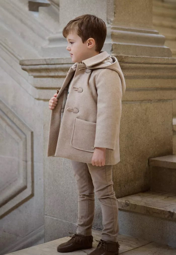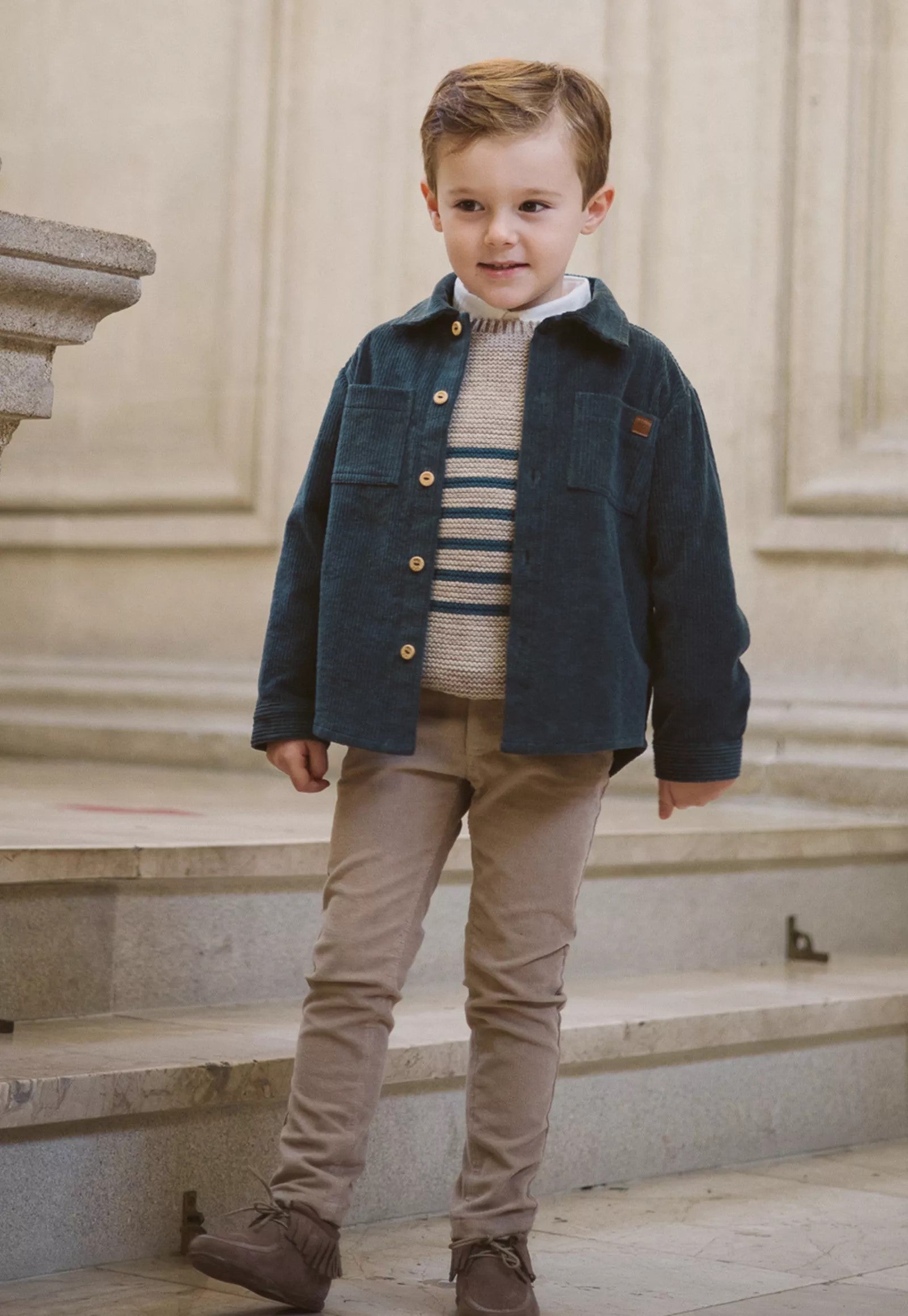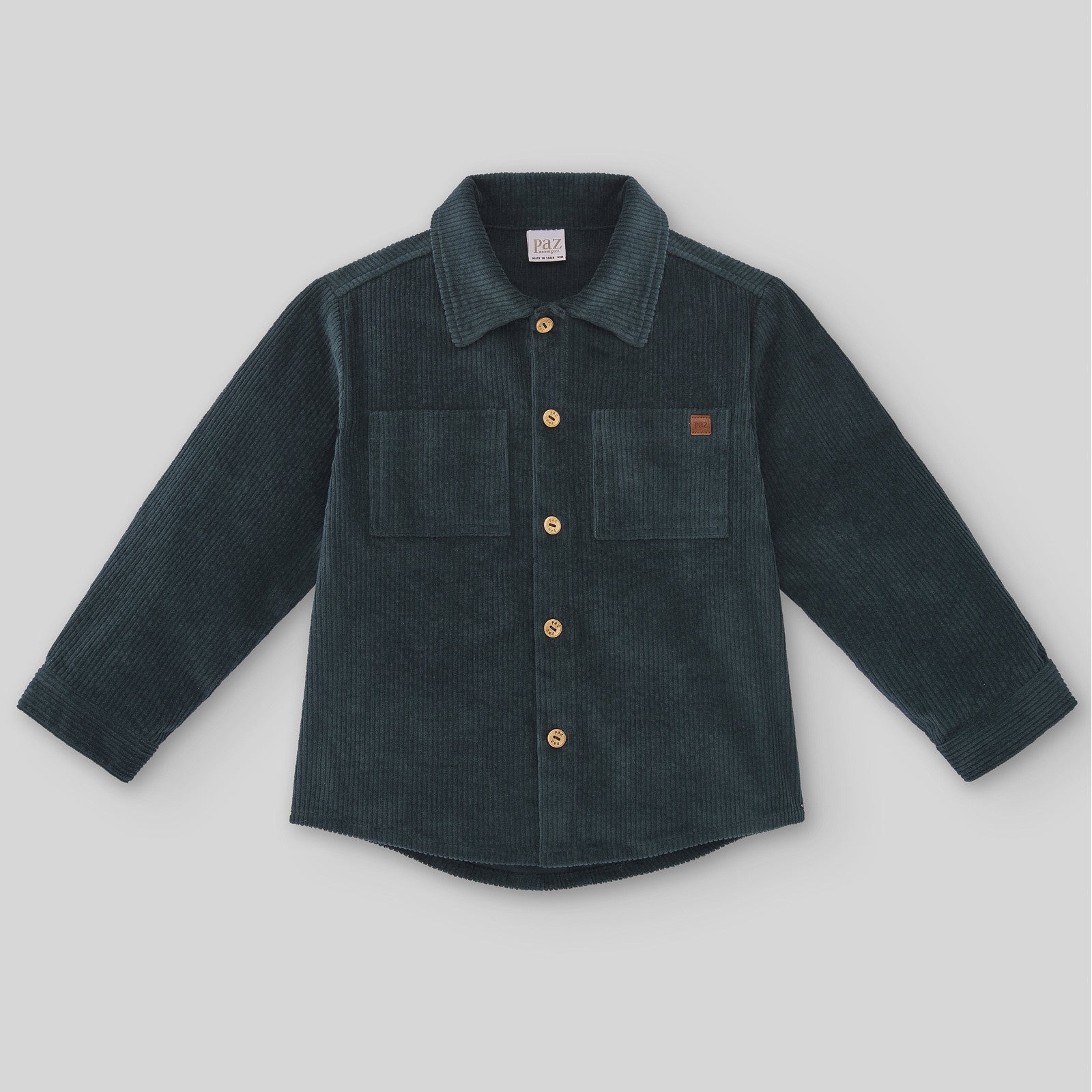 Sobrecamisa de 3 meses a 10 años, de cuello solapa y manga larga acabada en puño. Bolsillos de plastrón en delantero. Bajo redondo. Cierre frontal con botonadura de madera.