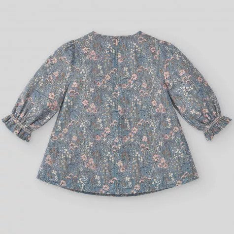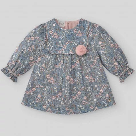 Vestido para bebé niña desde los 3 meses hasta los 6 años. Estampado de flores. Detalle de pompón y frunces en el puño. Cierre trasero con cremallera.